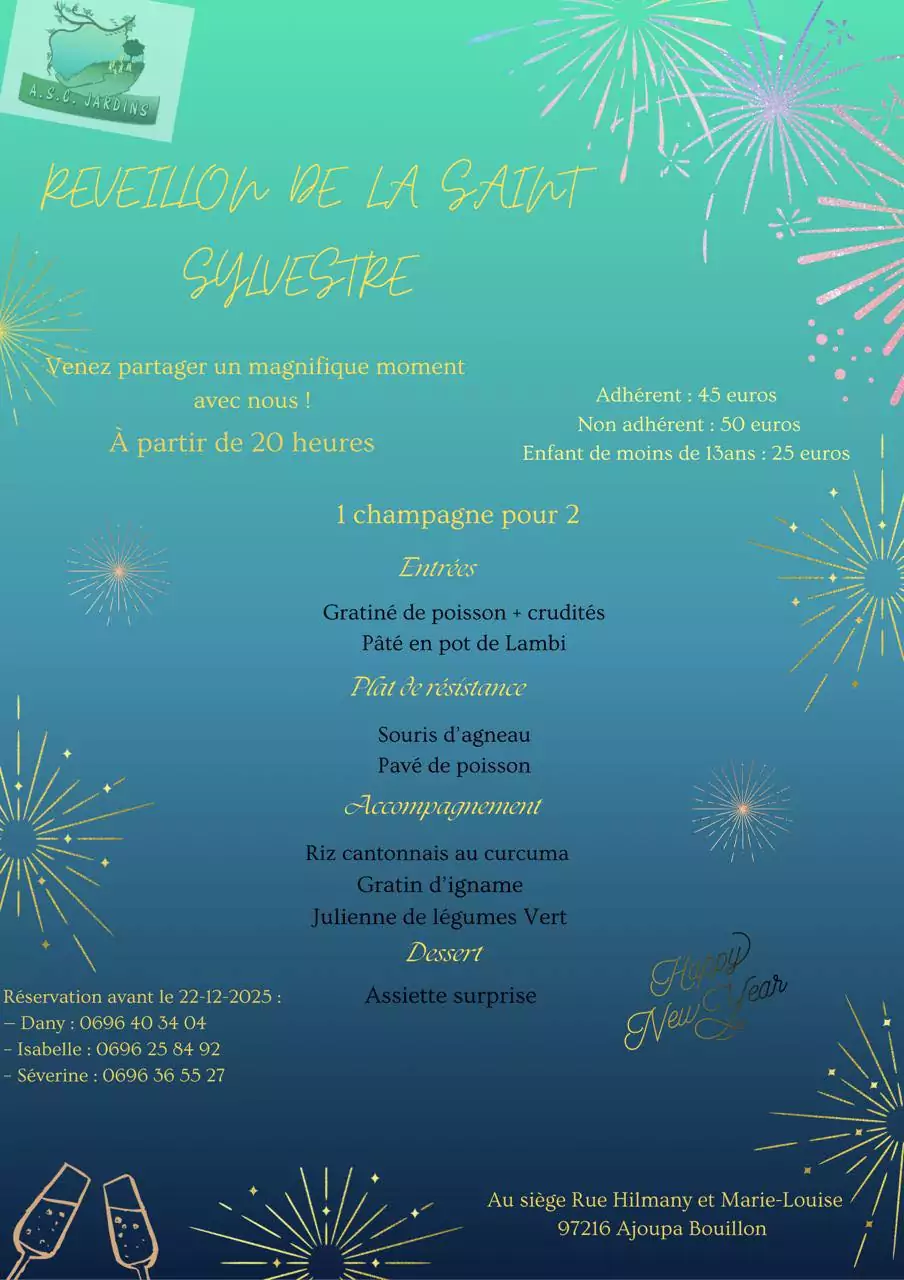 ASC Jardins invites you to celebrate New Year's Eve in a festive and convivial atmosphere. Book before December 22, 2025 to guarantee your place! Info & reservations : 0696 40 34 04 | 0696 25 84 92 | 0696 36 55 27 Come and end the year on a high note, and start 2026 in good spirits ASC Les Jardins, rue Hilmany et Marie-Louise, Ajoupa Bouillon, +596 696 40 34 04