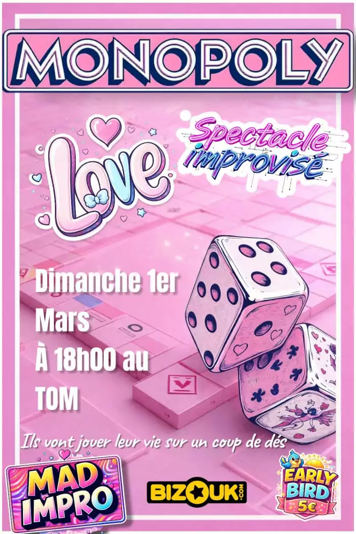 Monopoly du Love, created by the Mad Impro collective, is an evening where love becomes a game... and the game becomes completely uncontrollable. On stage, couples face off against each other on a revisited Monopoly board. With each throw of the dice, the rules change, situations get out of hand and the comedians improvise without limit. It's all about fun, absurd twists and turns, and lots of laughs. Alliances are made and broken, couples explode, reform, cheat... just like in real life, but much funnier. Nothing is written in stone, anything can happen, and above all... no one is safe from a bad move by des. You don't know the story they're playing out in front of your eyes... Neither do they. TOM, Teat' Otonom Mawon , Croix Mission, Boulevard du General de Gaulle, 122 rue Victor Severe, Fort de France Improv theater company made in Martinique Mad Impro, 0696 18 11 64, Lemontdesoliviers@gmail.com
