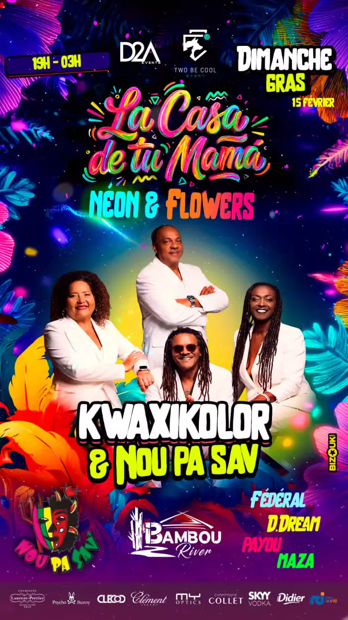 Tous les jours gras a partir de 12h30, on detourne le vide au Kaz Bayou Pause fraicheur devant le bar Le Bayou : bar a cocktails qui envoie, DJ tous les jours, food, goodies et bonne vybe. Tu sors du flot, tu respires, tu retrouves la team... et quand t'es pret, la rue prend le relai Le carnaval est une course de fond. Kaz B c'est LE detour strategique Lun-jeu-ven : 15h-00h / Week-end : 15h-02h Le Bayou, Bar Culturel & Social Club, 302 Bd de la Pointe Simon, Fort-de-France, lebayou.mq@gmail.com