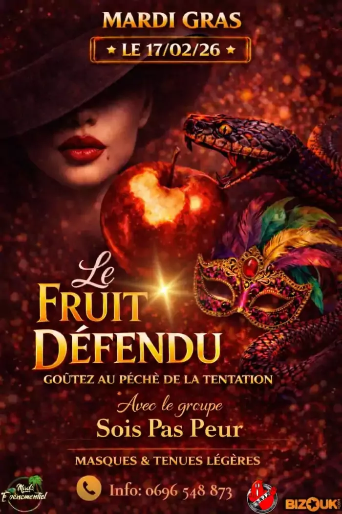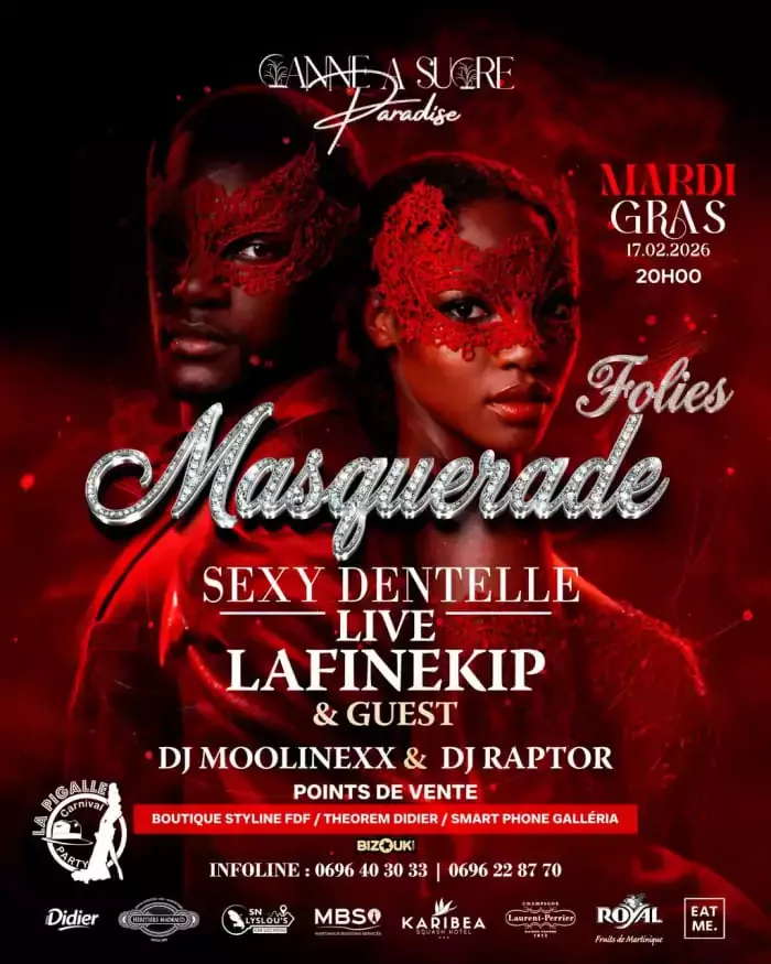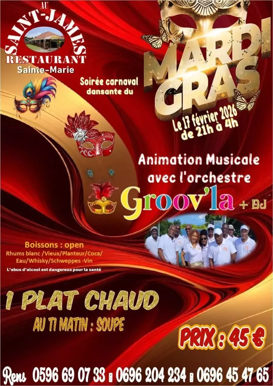 SOIREE CARNAVAL - MARDI GRAS Preparez vos plus beaux masques et vos plus belles tenues Animation musicale live avec l'orchestre GROOV'LA + DJ pour enflammer la piste toute la nuit Open Bar 1 plat chaud au petit matin : soupe Tarif : 45 EUR Ambiance carnaval, musique, danse, bonne humeur... Le rendez-vous a ne surtout pas manquer ! Ticket bientot en vente au restaurant Infoline : 0596 69 07 33 / 0696 204 234 / 0696 45 47 65 Saint-James Restaurant, route de L'Union, Sainte Marie, 0596 69 07 33 / 0696 45 47 65