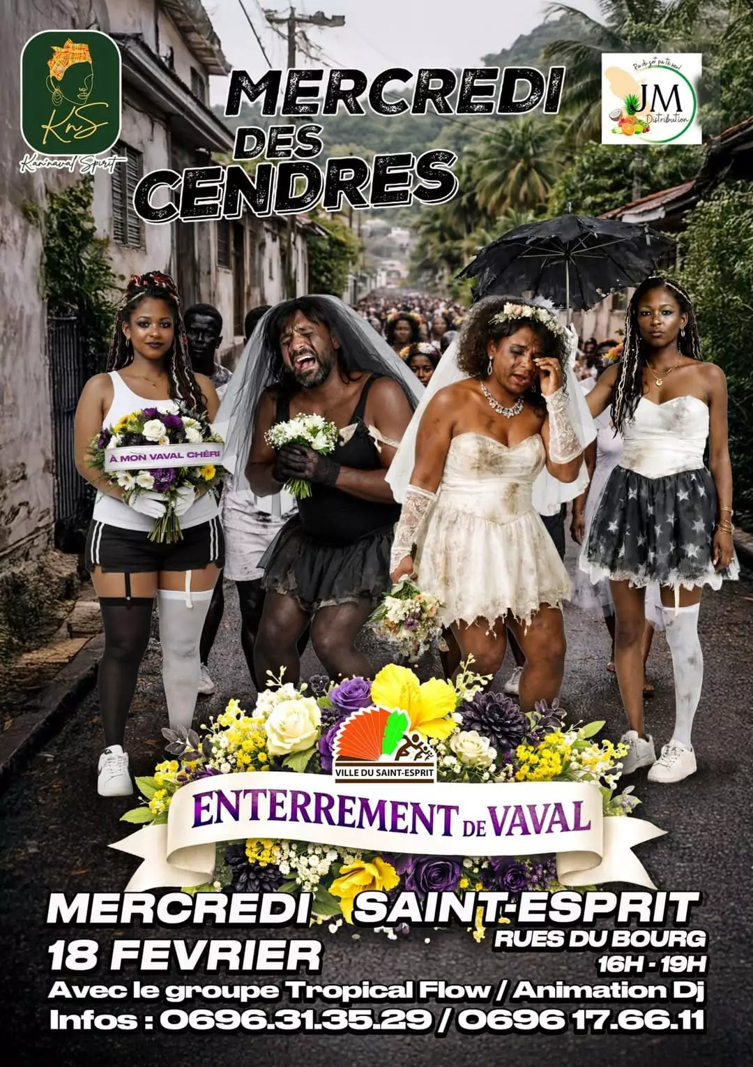 Kan'Naval Spirit et JM Distribution, avec le soutien de la Ville du Saint-Esprit, vous donnent rendez-vous le mercredi 18 fevrier 2026, dans les rues du bourg, pour l'incontournable Enterrement de Vaval. A l'occasion du Mercredi des Cendres, les tenues de deuil seront de mise ! Entre derision, larmes de circonstance et ambiance carnavalesque, rejoignez le cortege autour du char, aux rythmes du groupe a pied Tropical Flow.. De 16 h a 19 h, musique, energie collective et esprit festif accompagneront cette derniere parenthese avant l'entree en Careme. Ville du Saint Esprit