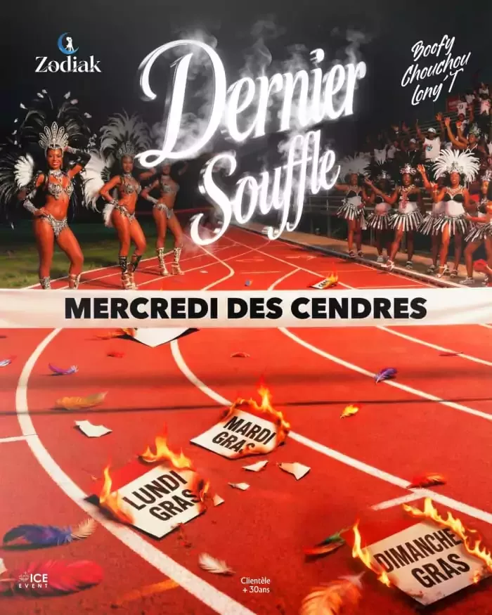 DERNIER SOUFFLE Ce Mercredi 18, le carnaval touchera a sa fin mais il restera assez d'energie pour une derniere nuit Plumes rangees, Couleurs eteintes, Place au noir & blanc Une derniere danse, Une derniere montee, Un dernier souffle avant le calme avec CHOUCHOU o BOOFY o LONY'T Recupere tes places ici Si tu dois sortir une derniere fois... c'est celle-la Le Zodiak, Centre commercial la Veranda, Fort-de-France, 0696 05 15 31