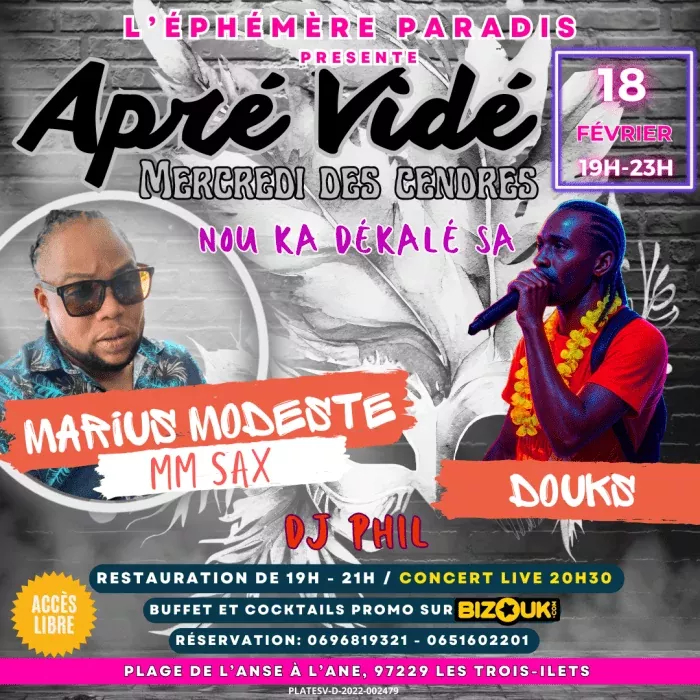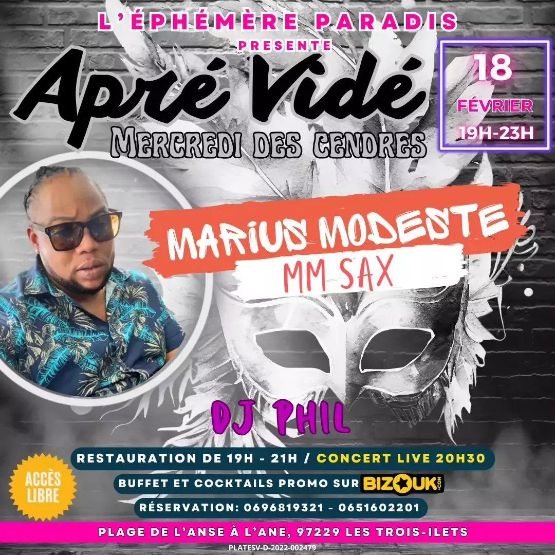 APRE VIDE - Mercredi des cendres 19h, Animation : DJ Phil fera vibrer le dancefloor 20h, Concert : Marius Modeste et son groupe MM Sax Tarifs : Restauration : 30EUR (comprenant un buffet gourmand et un dessert ) Reservations : Appelez au 0696 81 93 21 ou au 06 51 60 22 01 Remarque : Les reservations concernent uniquement la restauration. L'abus d'alcool est dangereux pour la santea consommer avec moderation. L'Ephemere, Plage de l'Anse a l'Ane, Les Trois Ilets, 0696 81 93 21