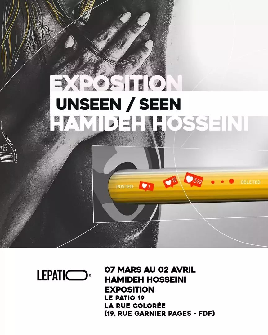 Une femme porte en elle des mondes. Certains vivent dans l'ombre. D'autres sont exposes a une lumiere implacable. Dans une premiere serie, le corps feminin se replie --non par faiblesse, mais pour se preserver. Il se protege, il rassemble sa force. Il existe au-dela de l'approbation, au-dela de la performance. Dans l'autre, le corps se tient sous le regard -- filtre, mesure, consomme. Ici, l'intimite devient image. L'emotion devient symbole. Le corps devient contenu. Unseen / Seen n'est pas une plainte. C'est une affirmation. Entre invisibilite et surexposition, entre silence et spectacle, la femme ne disparait pas. Elle se reapproprie. Elle resiste. Elle se transforme. Elle demeure -- non comme une image a regarder, mais comme une presence impossible a effacer. A woman carries worlds within her. Some are kept in shadow. Others are exposed to relentless light. In one series, the female body turns inward --not in weakness, but in preservation. It folds, it protects, it gathers strength. It exists beyond approval, beyond performance. In the other, the body stands beneath the gaze - filtered, measured, consumed. Here, intimacy is translated into image. Emotion into symbol. The body into content. Unseen / Seen is not a complaint. It is a statement. Between invisibility and overexposure, between silence and spectacle, a woman does not disappear. She reclaims. She endures. She transforms. She remains - not as an object to be seen, but as a presence that refuses to be erased. Hamideh Hosseini January 2026 Exposition - 07/03 au 02/04 Vernissage - 07/03 a partir de 17h LePatio19, Cafe Cultural CoWorking, La Rue Coloree, 19 rue Garnier Pages, Fort de France