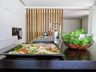 Grande cuisine ouverte et entièrement équipée : réfrigérateur, plaque induction, four, micro-ondes, cafetière Nespresso. Buanderie attenante : évier, lave-linge, sèche-linge, congélateur.